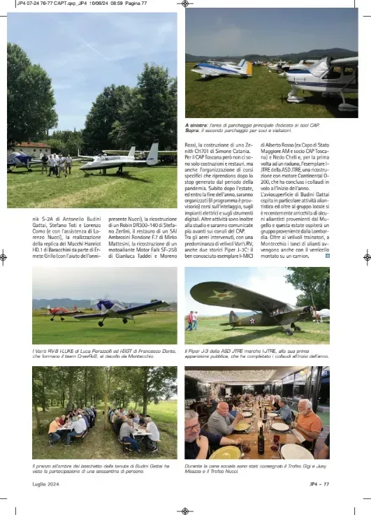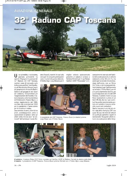 Svoltosi l'8 giugno 2024 presso l'accogliente aviosuperficie Sant'Apollonia di Montecchio, il 32° Raduno del CAP Toscana ha celebrato ancora una volta l'eccellenza della costruzione amatoriale italiana. Sotto la guida del presidente Franco Bucci e grazie all'ospitalità di Antonello Budini Gattai, oltre 60 tra piloti e soci si sono riuniti in una splendida giornata primaverile, animata da una trentina di velivoli di pregio. Momento centrale dell'evento è stata la consegna dei prestigiosi riconoscimenti durante la cena sociale. Il Trofeo 'Gigi e Jusy Meazza' per il miglior velivolo autocostruito è stato assegnato a Stefano Ferretti per il suo iconico Rutan VariEze I-VEZE 'Provocator', un progetto che vanta ormai cinquant'anni di storia, rinvigorito da una recente rimotorizzazione con un Rotax 912 Turbo che ne ha elevato le prestazioni. Il Trofeo 'Nucci' è stato conferito a Luigi Rossi, pilota e costruttore di un Van's RV-8, premiato per lo straordinario impegno associativo e per aver introdotto ben otto nuovi soci costruttori nel sodalizio. Tra i prati dell'aviosuperficie spiccavano numerosi esemplari della famiglia Van’s RV, la replica del Macchi Hanriot HD.1 di Baracchini e lo storico Piper J-3 dell'ASD JTRE al suo debutto pubblico. L'evento ha inoltre offerto lo spunto per annunciare i futuri corsi tecnici su intelaggio e strumentazione digitale, confermando la vitalità di una sezione che conta oggi quasi 80 soci e oltre 50 velivoli operativi o in fase avanzata di costruzione presso le officine locali.